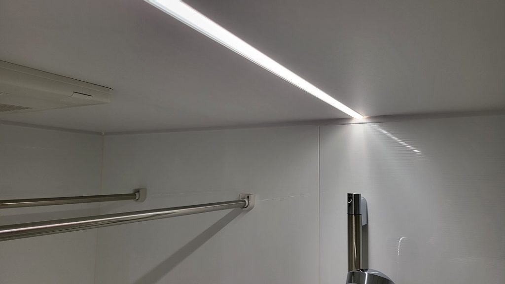 天井にフラットに納まる1本の照明が、空間に洗練された印象を与えます。その時々の気分に合わせて光の色をコントロールできます