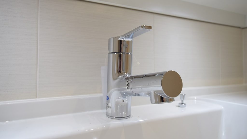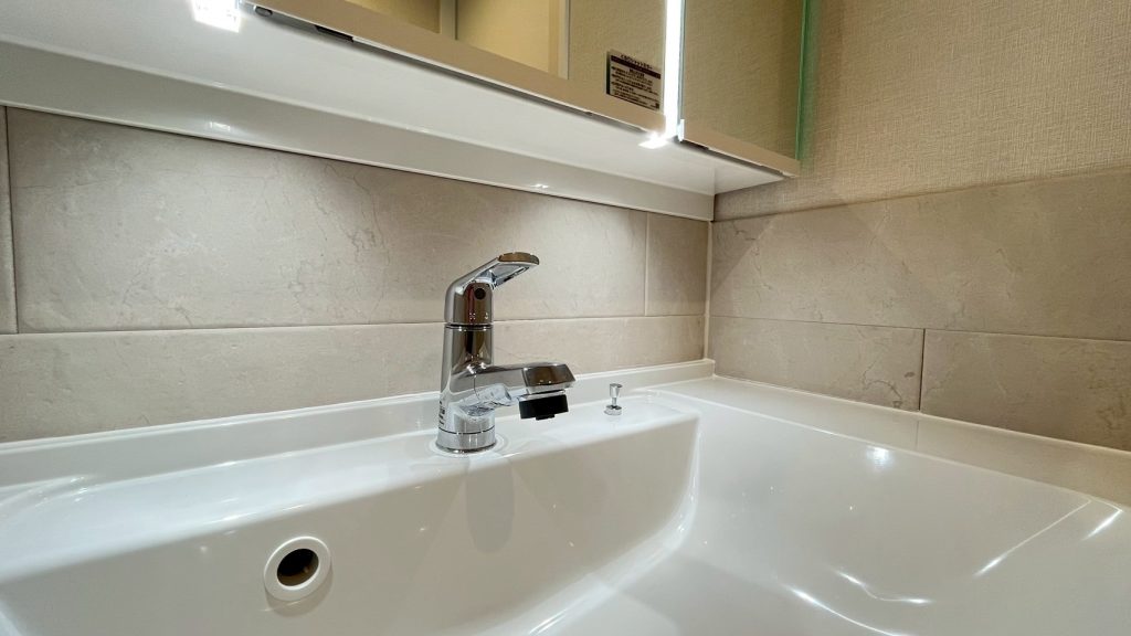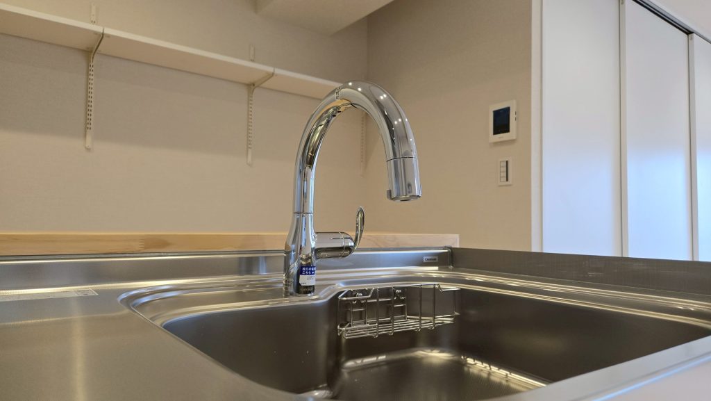 使い勝手の良いシングルレバーで、シャープでモダンな印象を与えるメタルタイプの水栓を採用しました