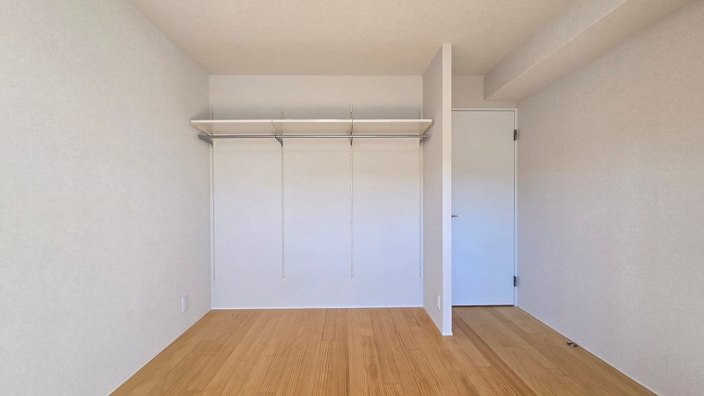 収納内の棚とハンガーパイプは可動で、追加可能です。想定箇所に下地入れ、収納折戸を後付けできます※物件により設置できない場合もあります