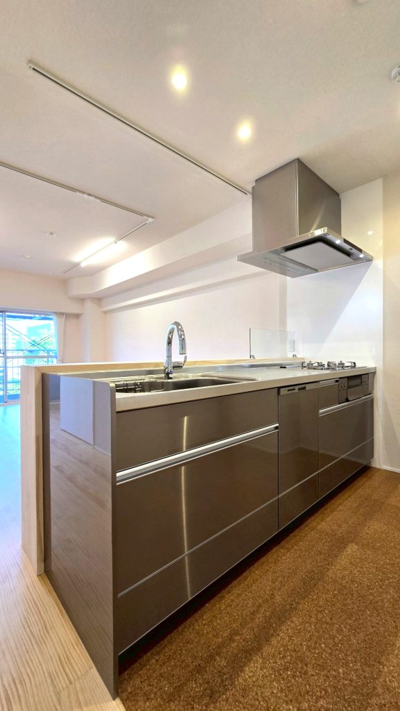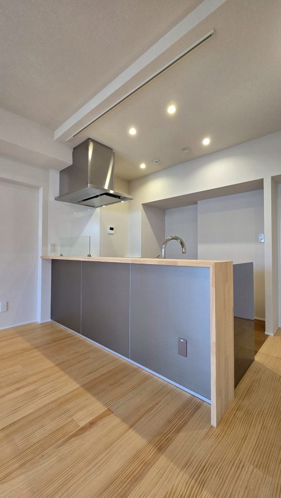 リビングダイニングのシンボルとして、単なる「設備」ではなく「美しい家具」として考えました。無機質で研ぎ澄まされた質感のステンレス素材は、周囲の無垢材と対比し、空間全体に洗練された印象をもたらします