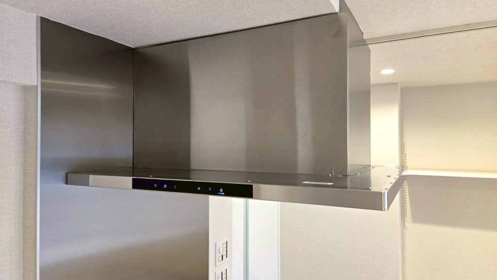 お湯をセットするだけでファンとフィルターを自動で洗浄できるフードを採用。さらに、ステンレスの美しい光沢が清潔感と高級感を保ち、キッチンと一体となり空間に映えます