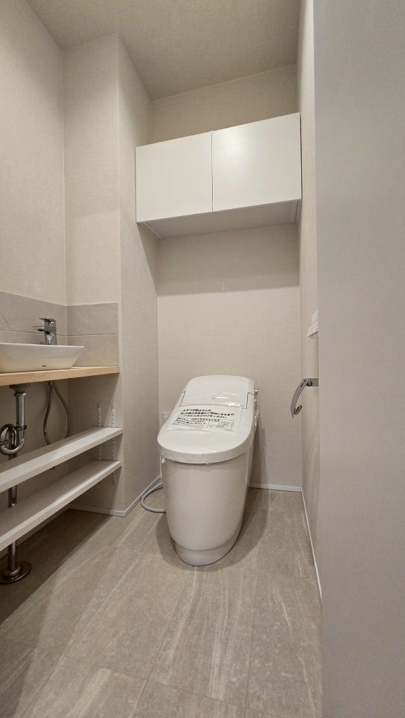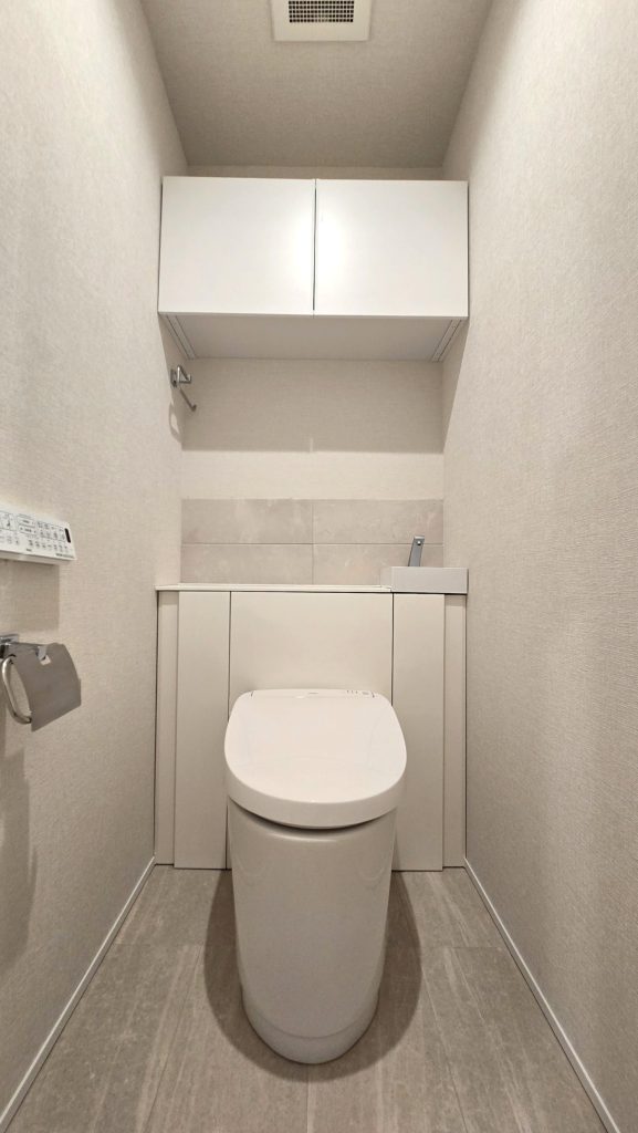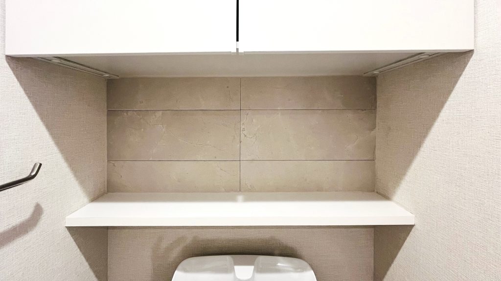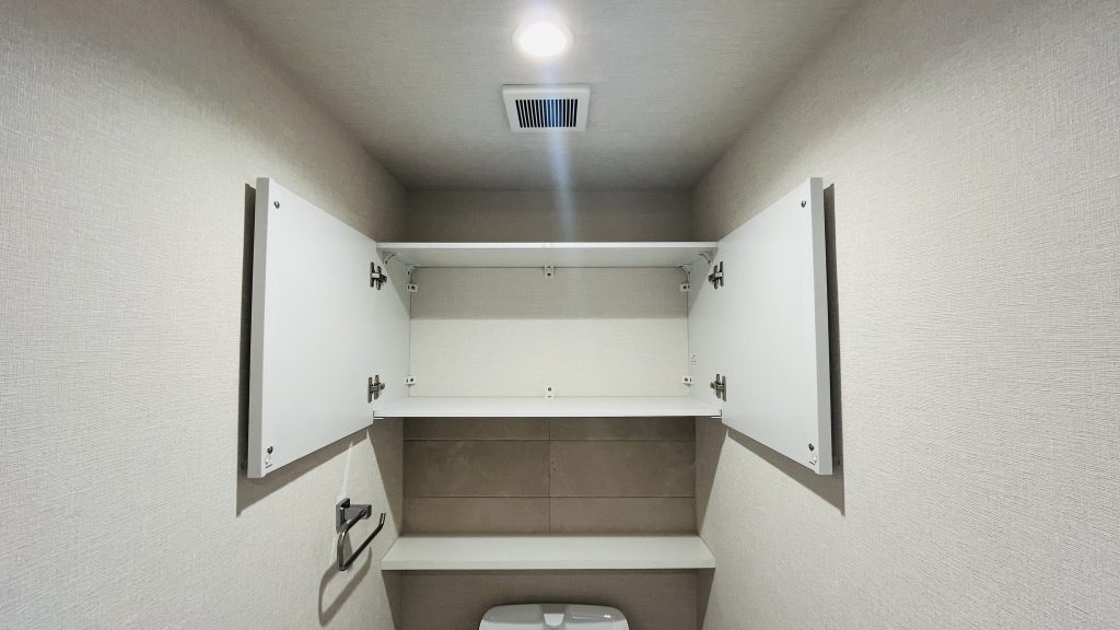 デッドスペースになりがちな便器上部に、収納を確保。扉付きのため中身が見えず、空間をすっきりと見せます