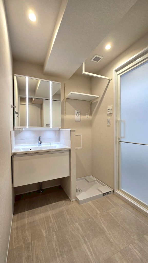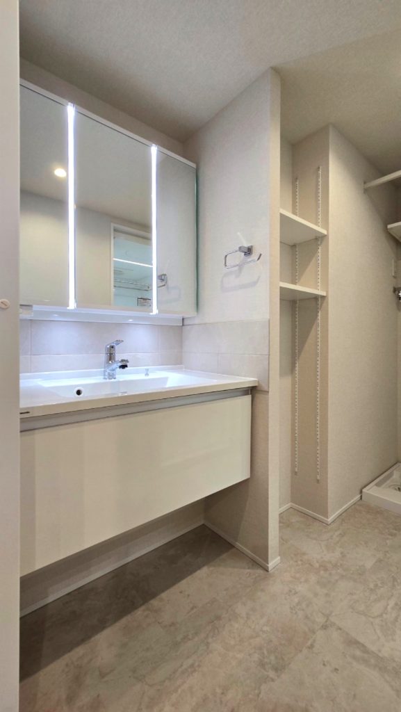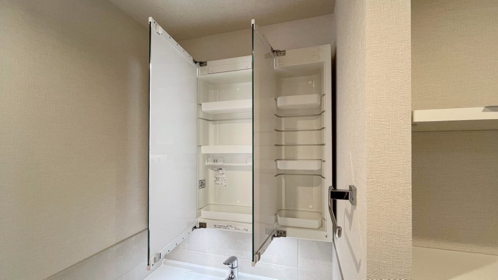 顔をしっかり照らしてくれるタテ型照明付きの3面鏡は、鏡裏が全面収納となっており、洗面まわりの小物をたっぷり収納できます