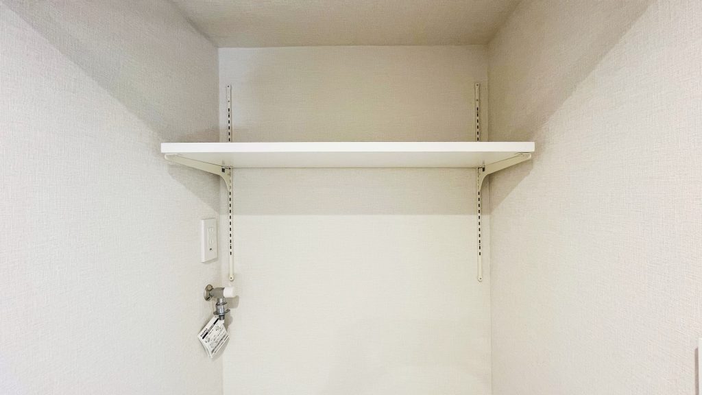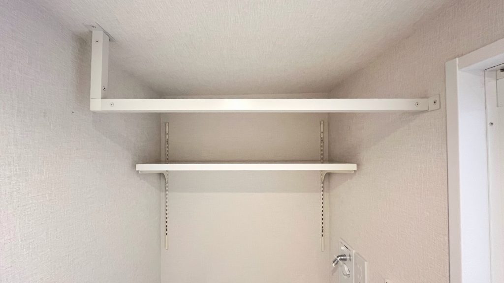 洗濯機上のデッドスペースを有効活用できるよう、高さを自由に変えられ、必要に応じて棚を追加できる収納を設置しました。ハンガーパイプも設置でき、使い方をカスタマイズできます