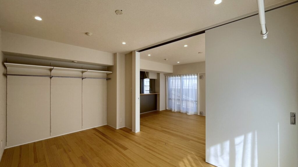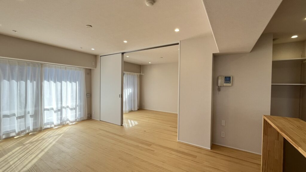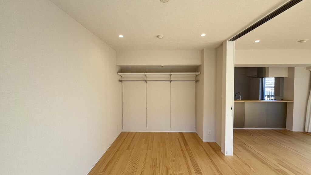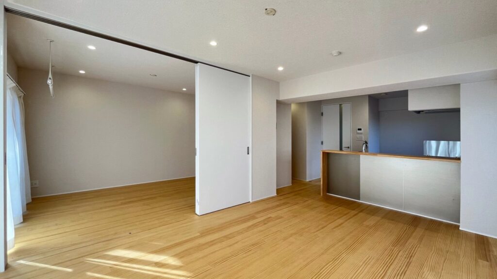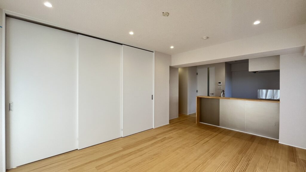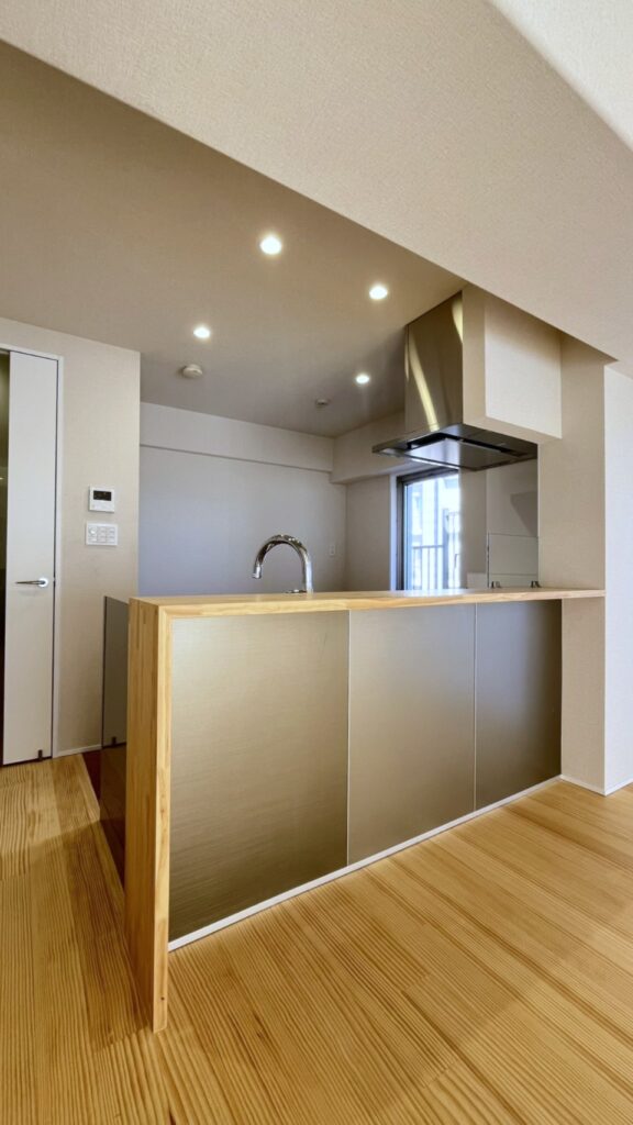 15帖を超える空間にカウンターと一体化したキッチンを置くことで、コミュニケーションも取りやすい広がりのあるLDKとしました