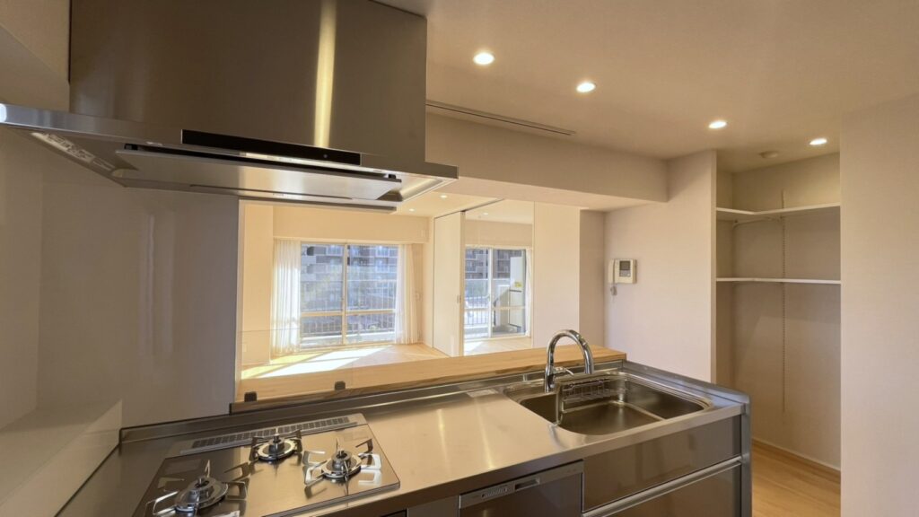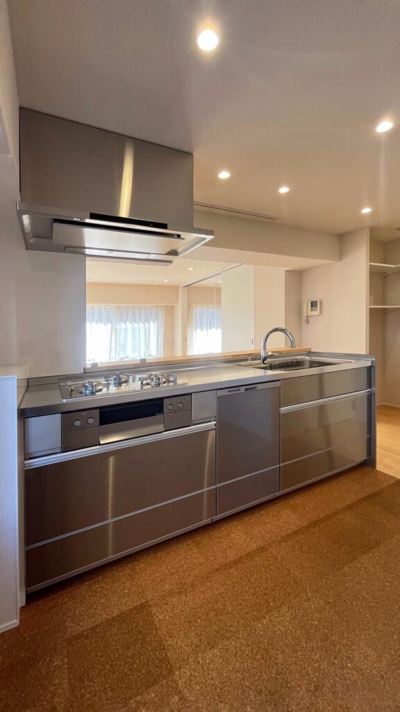 | ステンレスシステムキッチン(洗エールレンジフード、ガラストップコンロ、浄水器一体型水栓、深型食洗機) |