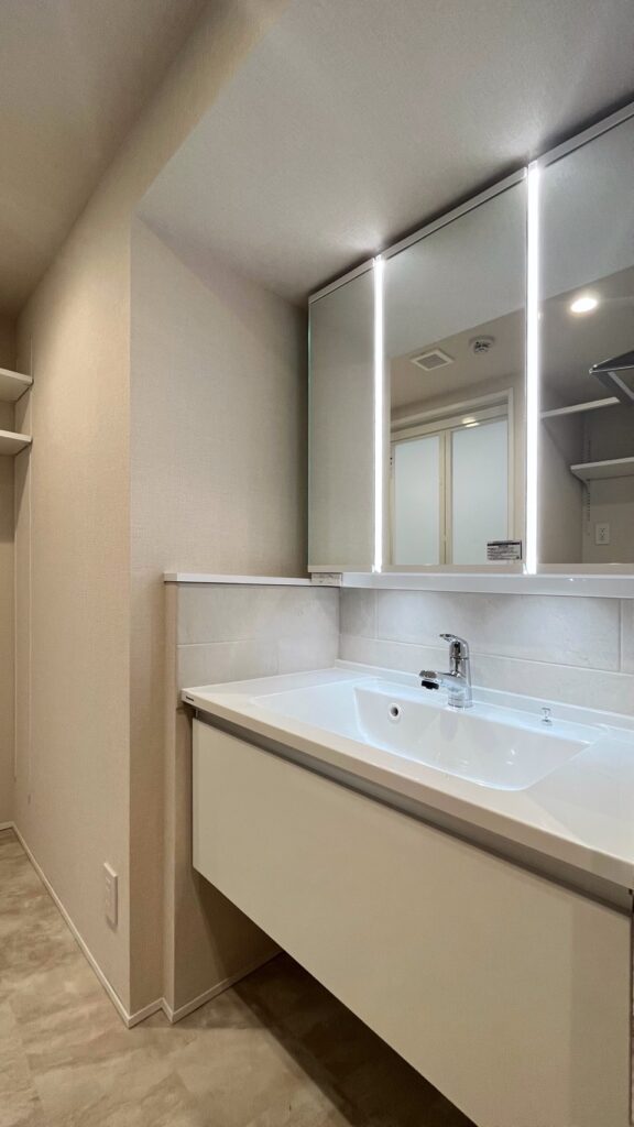 | フロート洗面化粧台(収納付3面鏡、ツインラインLED照明、シャワー水栓) |