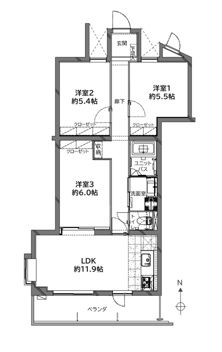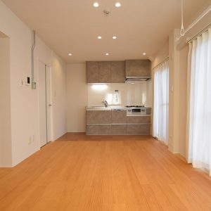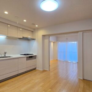 吊戸棚付でモダンな石目調が印象的なキッチンや、真っ白で清潔感のある浴室やトイレ、家具のようにシンプルですっきりしたデザインの洗面化粧台