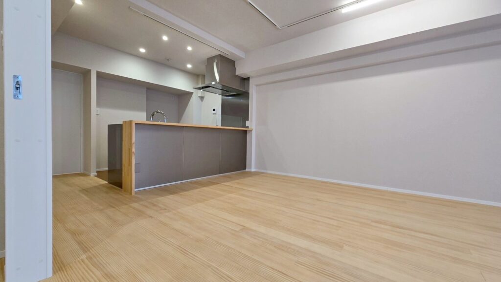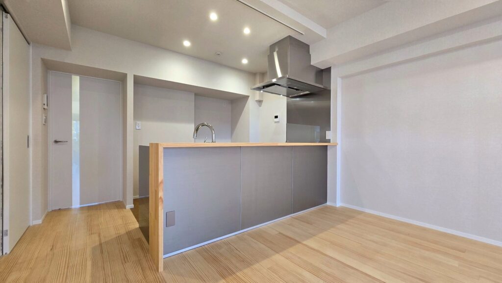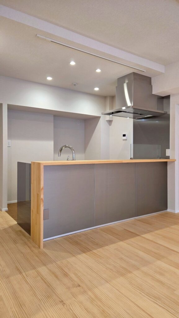 16帖を超える空間にカウンターと一体化したキッチンを置くことで、コミュニケーションも取りやすい広がりのあるLDKとしました