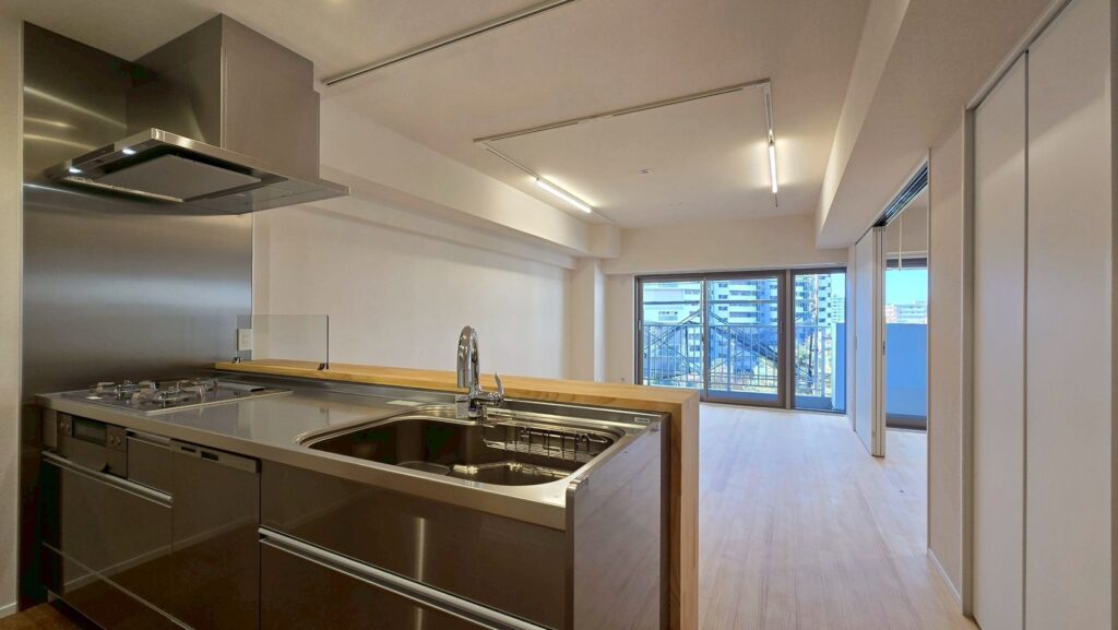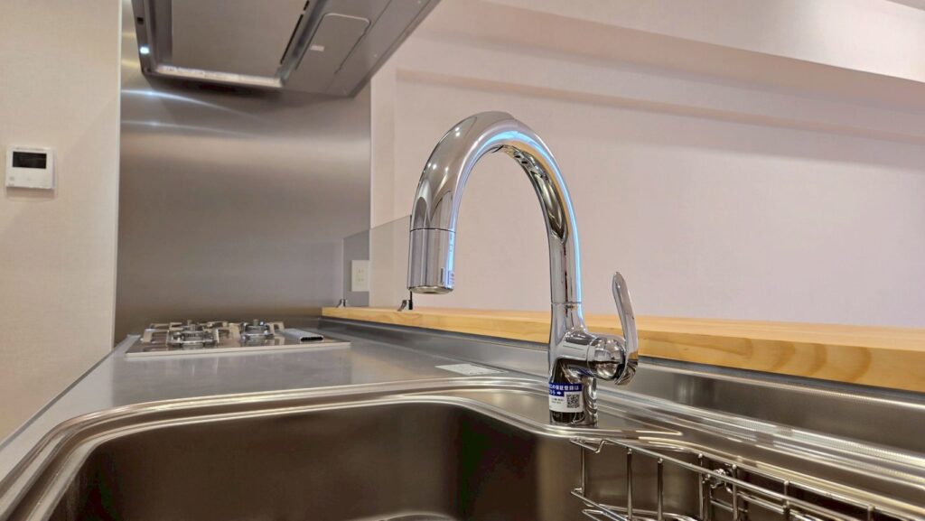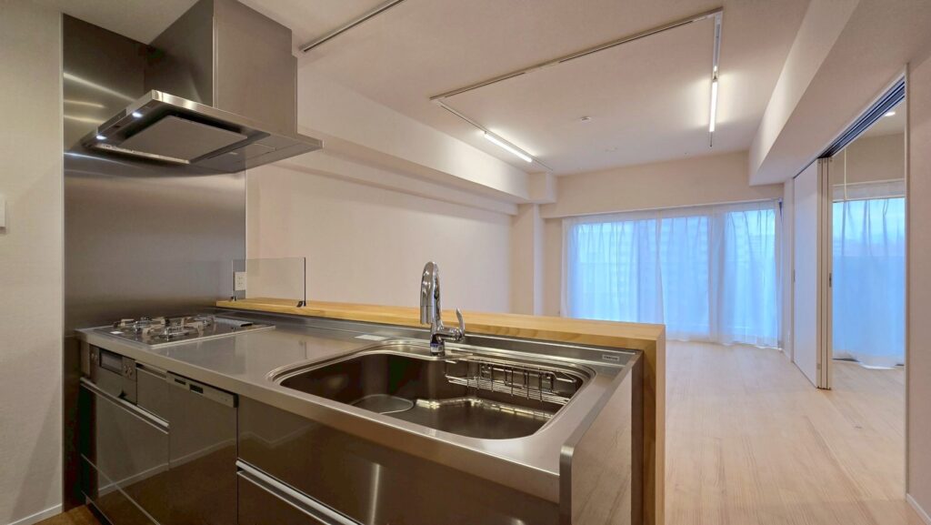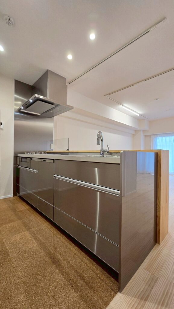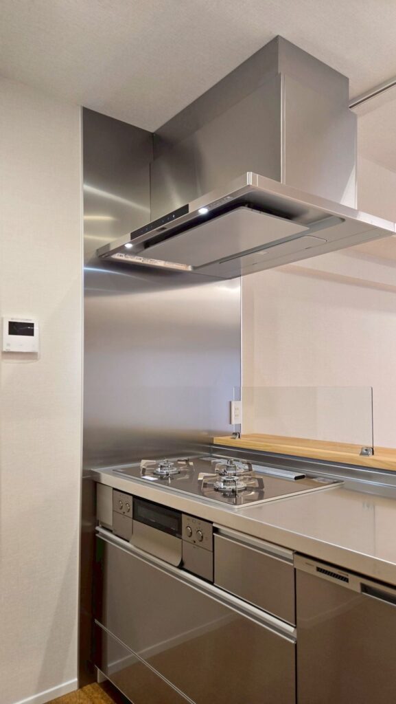 | ステンレスシステムキッチン(洗エールレンジフード、ガラストップコンロ、浄水器一体型水栓、深型食洗機) |