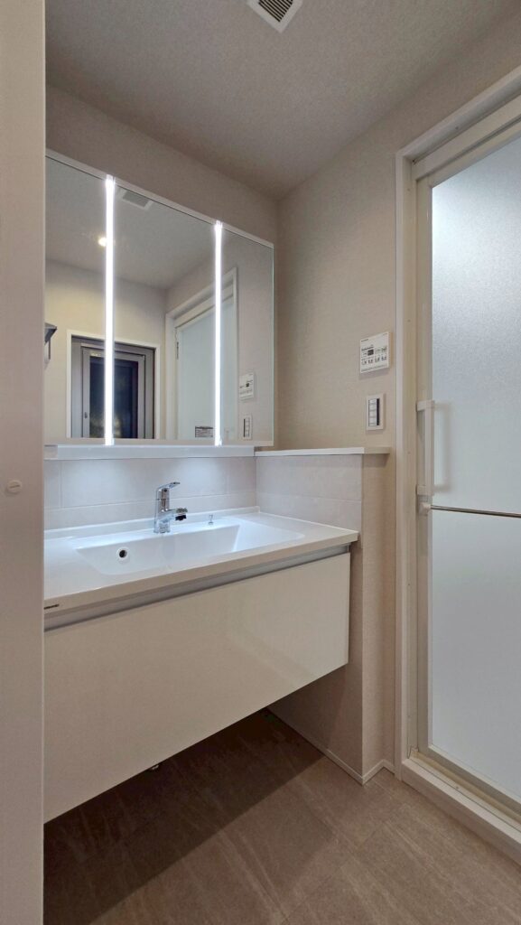 | フロート洗面化粧台(収納付3面鏡、ツインラインLED照明、シャワー水栓) |